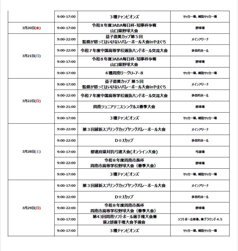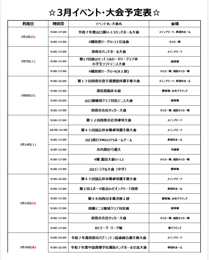 2026年3月の大会・イベント情報をお知らせします。