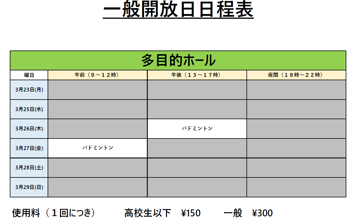 次週の一般開放及び、可能種目のご連絡です。